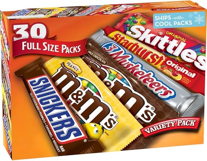 This bulk pack is awesome! You get all the best candies in one place¡ªM&M¡¯s, Snickers, Skittles, 3 Musketeers, and Starburst. Perfect for when you have a sweet tooth, and the full-size bars are such a great bonus. Highly recommend for anyone who loves candy!